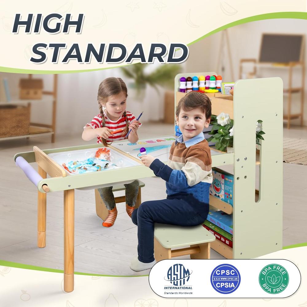 Safer, Friendly & Duable: children craft desk and chairs are made from 100% natural beech & pine wood. Waterproof, not easily deformed for decades. The sensory bins are high-hard food grade ‌ABS, meeting ASTM and CPSIA standards. We protect children’s health with care and love