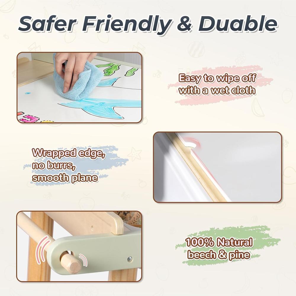 2025 Exclusive Design: kids art table and chair set combines writing, sensory activities, double-sided drawing board and storage into one. Also paper roll holder is included. An independent space to learn and play at home, daycare and preschool