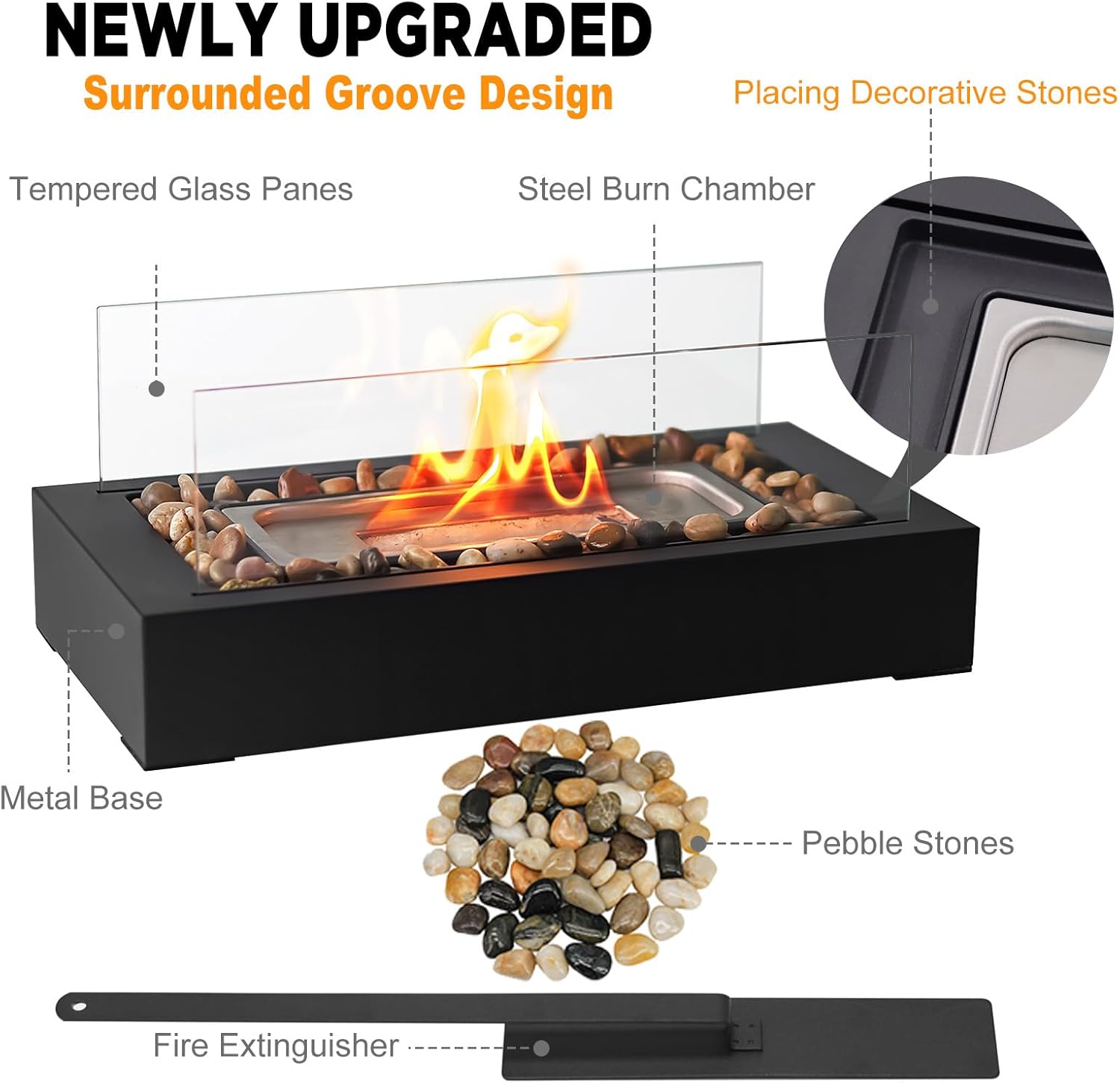 Upgraded Patented Design- glanzfeuer smores maker kit with new surrounded groove design, decorative stones stay put and won’t fall into the combustion chamber. Keep your space stylish and neat—no messy spills to worry about !