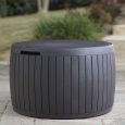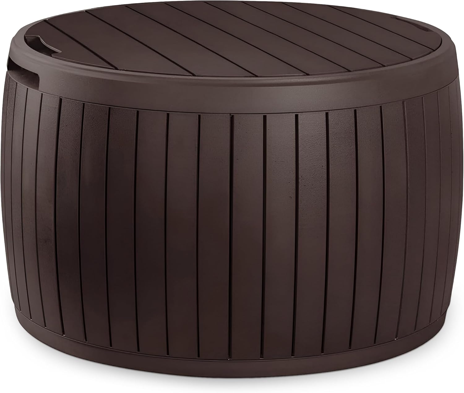 Multipurpose Elegance: Store everything from toys and towels to gardening tools and pool equipment in this Circa round deck box, a multifunctional wood-like textured ottoman for your yard.
